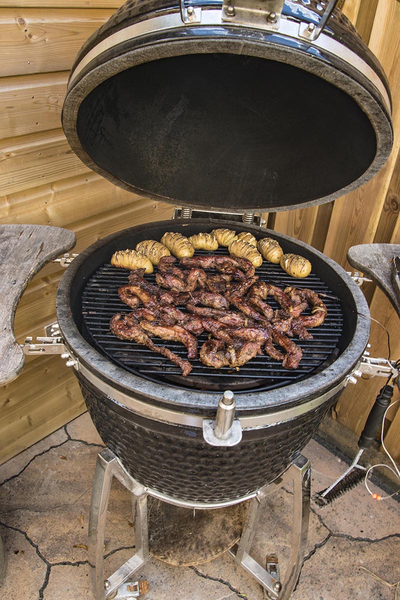 De bereidingstijd voor de iberico rbfingers is ongeveer 1.5 tot 2 uur. Ik ben zelf om half 3 begonnen met de bbq aan te steken. Trek hiervoor ongeveer een 20 minuutjes uit om de bbq op 150 graden te krijgen. Voordat je de ribfingers op de gril legt gooi je nog even het blokje kersen rookhout op de kolen, dit geeft een extra dimensie aan je vlees en piepers ;-). De vingertjes gaan dan indirect op de kolen. Als je nog een uurtje te gaan hebt leg je aardappelen erbij.
