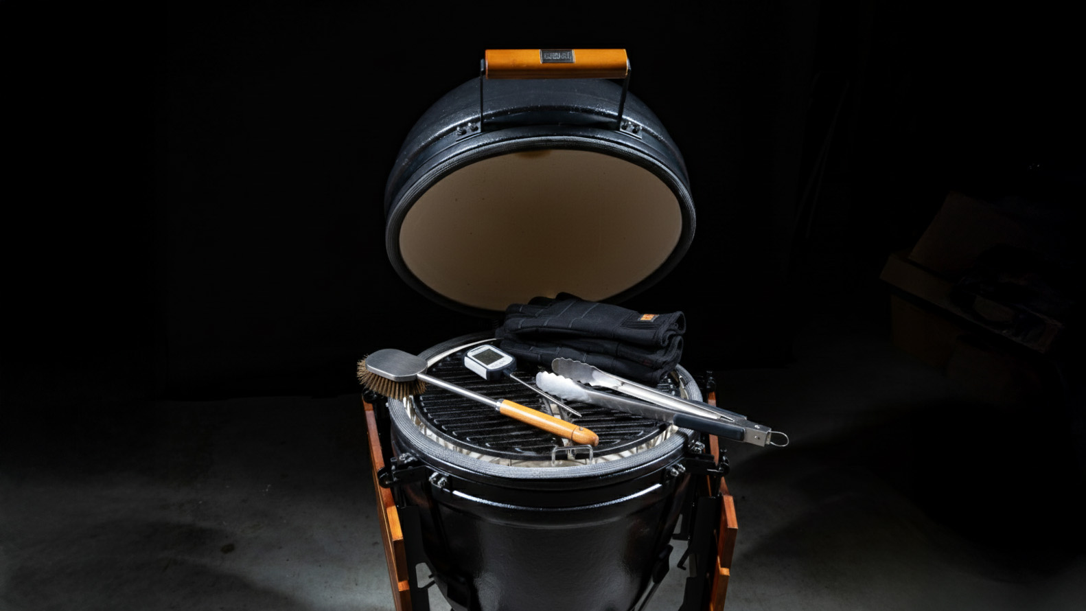 Een multilevel systeem met heat deflectors, een thermometer met roosterprobe, een tang en handschoenen.